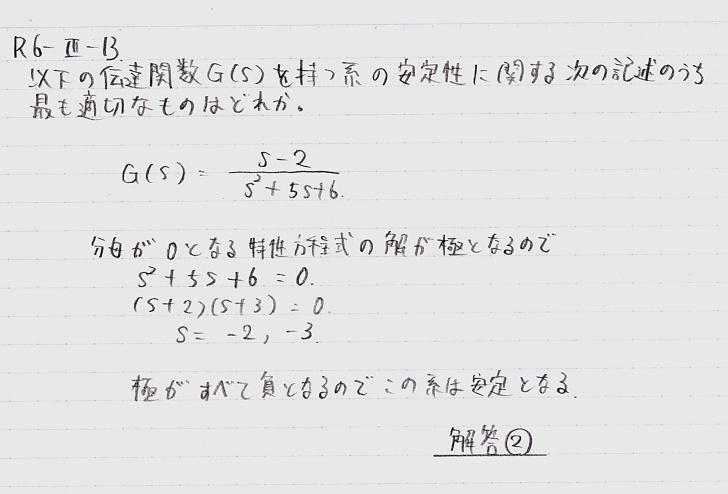 この問題は、伝達関数の安定性に関する問題です。分母の特性方程式が0となる時の解が極となるので、その極を求めます。極の符号がマイナスの時は系は安定となりますので、答えは②となります。零点は2となりますが安定性の判別はできませんので、④は不適切となります。解答は②となります。 計算式等は勉強ノートを参照ください。