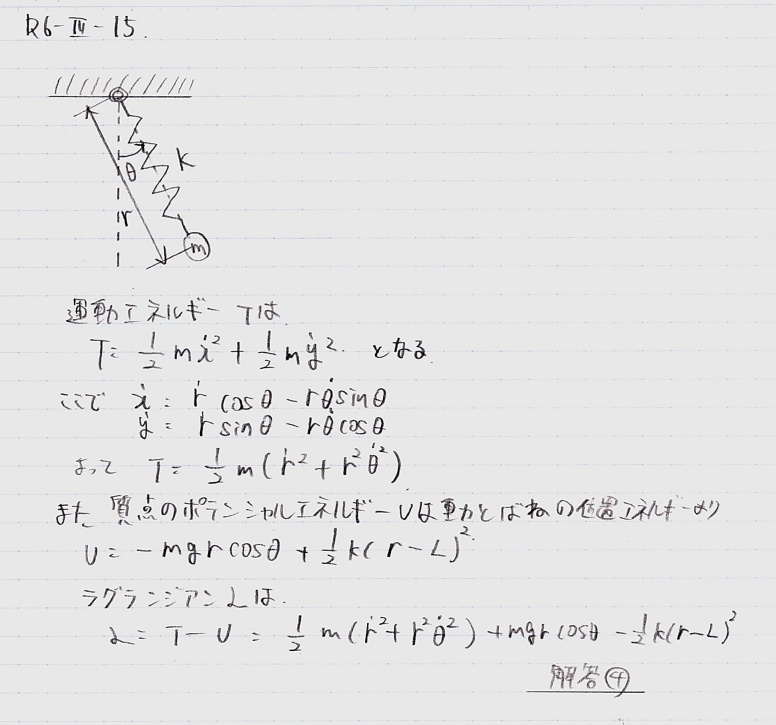 この問題は、バネ振り子のラグランジュ関数を求める問題です。ラグランジアンとは運動エネルギーからポテンシャルエネルギーを引いたもので物体の運動を記述するための関数になります。それぞれのエネルギーを求めてから、ラグランジアンを求めましょう。解答は④となります。 計算式等は勉強ノートを参照ください。