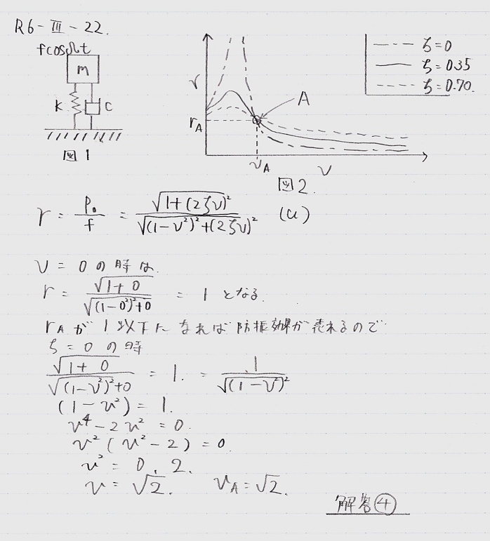 この問題は、1自由度振動系においての振動伝達率と振動数比に関する問題です。振動伝達率の式が与えられていますので、減衰比と振動数比の関係から一定値となるところを見つけます。振動数比が約1.4以上あれば防振効果があると言われておりますので、その事を知っていれば計算しなくても答えが分かると思います。解答は④となります。 計算式等は勉強ノートを参照ください。