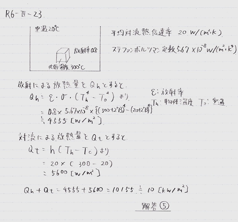 この問題は、熱源からの熱流束を求める問題です。放射と対流による放熱がありますのでそれぞれを求めてから足し合わせればよいです。単位にも注目して置けば公式を忘れても導出できるかもしれません。解答は⑤となります。 計算式等は勉強ノートを参照ください。