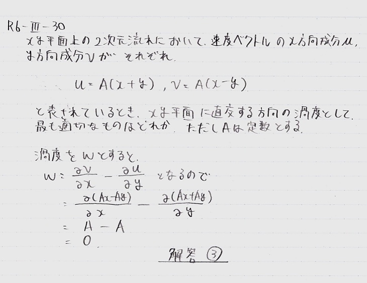 この問題は、平面上の2次元流れにおいて、その平面に直行する渦度を求める問題です。v、uをそれぞれxとyで偏微分すれば良いので計算すると渦度は0になります。過去にも同様の問題が出題されていました。解答は③となります。 計算式等は勉強ノートを参照ください。
