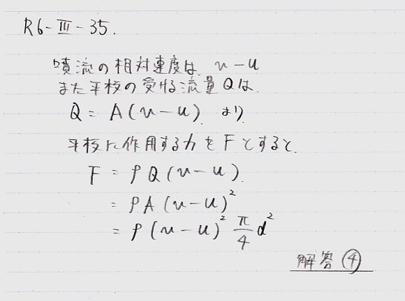 この問題は、ノズルから噴出する噴流が平板に衝突する時の力を求める問題です。相対速度から流量を求めると平板に作用する力を求めることが出来ます。解答は④となります。 計算式等は勉強ノートを参照ください。