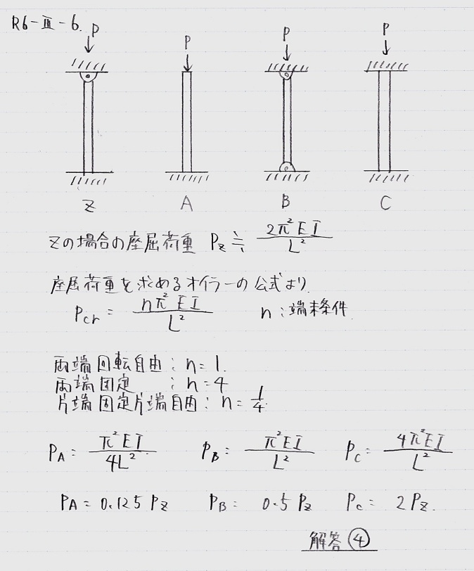 この問題は、長柱の座屈荷重が拘束条件によってどのように変化するかを求める問題です。拘束条件の違いで座屈荷重は変わりますが基本の公式を覚えておけば問題ないです。座屈荷重に関する問題はよく出題されますので覚えておきましょう。解答は④となります。 計算式等は勉強ノートを参照ください。